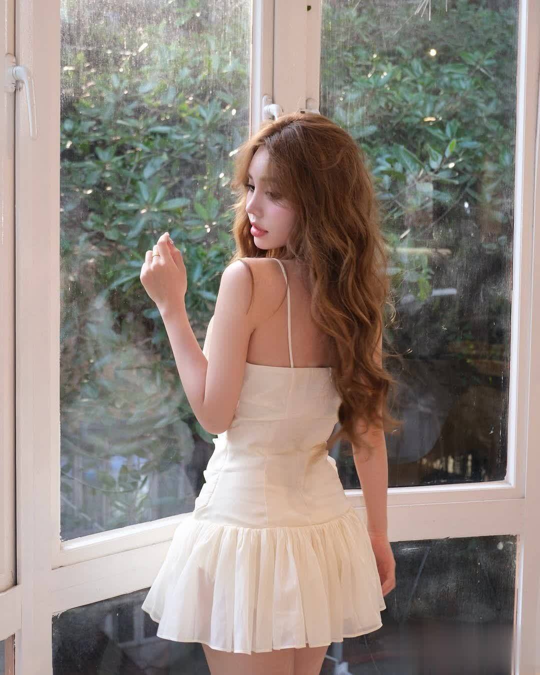 一只手轻抬靠近窗边,手指轻弯,另一只手自然垂落,身体微微侧转,不直挺挺的背影更显柔美。